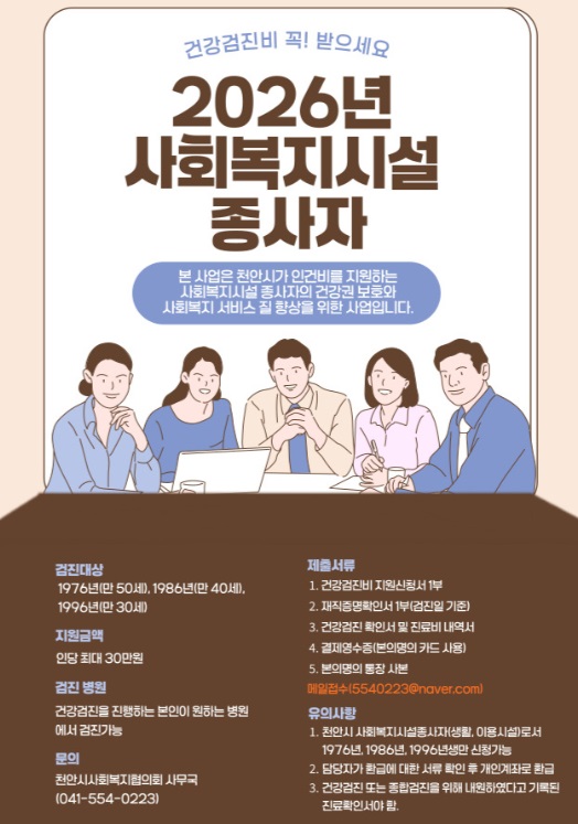 2026년 사회복지시설종사자 건강검진비 지원사업 안내 페이지 정보 작성자작성자 : 천사협 조회조회수 : 396회 작성일작성일 : 26-03-03 15:54 본문 2026년 사회복지시설종사자 건강검진비 지원사업 안내드립니다. 첨부파일 건강검진비 지원 신청서2026년 최신본.hwp (20.5K) 24회 다운로드 목록 이전글-사회복지시설 종사자 처우개선을 위한 '시립예술단 연계 문화·예술공연 관람' 지원 계획 26.03.16 다음글2026년 예산서 공고 25.12.31