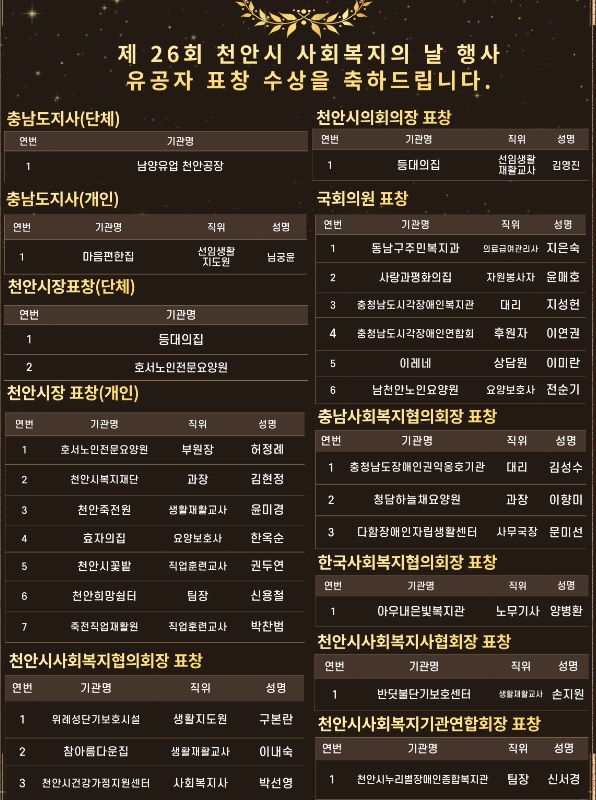 제 26회 천안시사회복지의 날 행사 유공자 표창수상 페이지 정보 작성자작성자 : 천사협 조회조회수 : 1,352회 작성일작성일 : 25-09-23 13:14 본문 수상을 축하 드립니다! 목록 이전글2025년 법인 정기 이사회의(2차) 개최 25.03.11 다음글「제26회 천안시사회복지의 날 행사」사회복지 유공자 추천 협조 요청 25.07.28